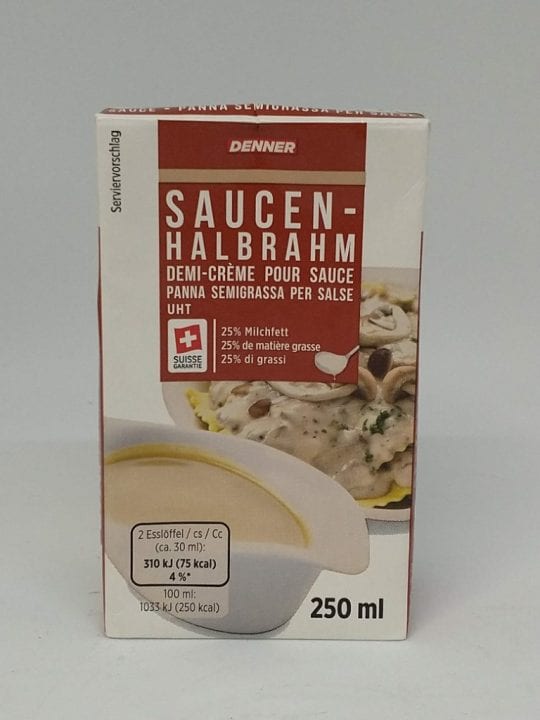 Avis d'allergènes Contient Lait. Valeurs nutritionnelles 100 ml 2 cuillères à soupe (30 ml) % * Énergie 1060,0 kj (256,0 kcal) 320,0 kj (77,0 kcal) 4% Lipides 25,3 g 7,6 grammes 11% dont acides gras 14,9 g 4,5 g 23% Les glucides <4 g <1 g <0,5% dont sucres 3,5 g 1 g 1% Fibres alimentaires 0 g Protéines 3 g 0,9 g 2% Sel 0,1 g 1% *% de l'apport quotidien de référence pour un adulte (8400kJ / 2000kcal) Espace de rangement Conserver à max. + 5 ° C. Origine Produit suisse